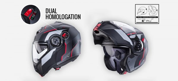 DUKE EVO je homologovan ECE 22.06 sa dvostrukom homologacijom “P/J” koja vam omogućava bezbednu vožnju i sa otvorenim štitnikom za bradu zahvaljujući poluzi P/J na levoj strani šlema. Kada je na ‘J’ blokira pomeranje štitnika za bradu iz potpuno otvorenog položaja.