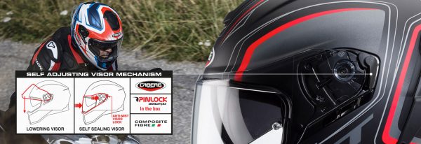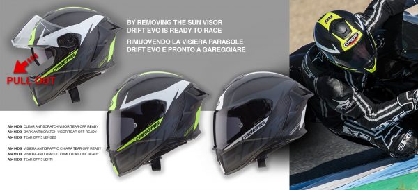 DRIFT EVO mehanizam za brzo oslobađanje omogućuje samo-podešavanje vizira koji garantuje bliski kontakt vizira i otvora kacige. Zahvaljujući vizirskom mehanizmu sa dvostrukim pokretom opruge, neće biti neophodno ručno regulisanje, kako bi se izbegao dolazak vode ili vazduha. Štaviše, ručica sa leve strane mehanizma za vizir pristaje da zaustavi poziciju vizira na 0,5cm od otvora kako bi se izbeglo ili eliminisalo fogovanje(zamagljivanje), čak i pri većoj brzini. Kada je ručica podignuta, vizir je zaključan kako bi se izbeglo iznenadno otvaranje tokom vožnje ili pada.