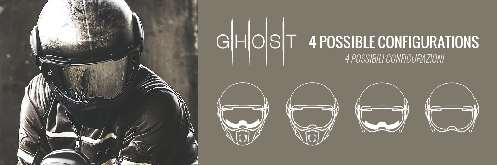 GHOST SE MOŽE KORISTITI U ČETIRI RAZLIČITE KONFIGURACIJE : 1) opremljen štitnikom, profilom pene duž unutrašnje donje strane vizira i maske; 2) opremljena vizira i maske, ali bez penastog profila vizira; 3) opremljen sa vizira i profilom pene ali bez maske; 4) opremljena samo sa vizir, bez profila pene i maske.
