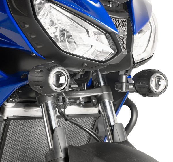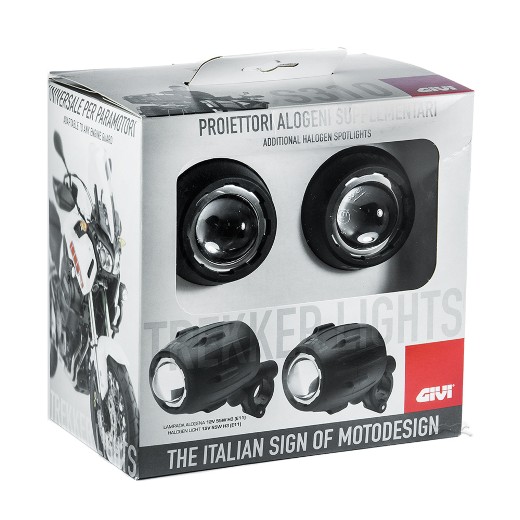 Par univerzalnih dodatnih reflektora sa halogenim svetlima, koji se montiraju na cevaste zaštitnike motora (ø minimum 21mm i ø maksimum 26mm). Moraju biti povezani sa baterijom motocikla i imaju prekidač koji se montira na cevasti rukohvat.